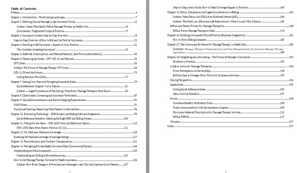 This book is not just about Billing… It is a Call to Action for YOU and the massage profession. I have added a Chapter on How to Get Massage therapy covered by health insurance and a Call to Action with 42 Action Steps that We need to start taking as a whole. I want to create a grassroots movement to bring awareness to massage and create the attention that it deserves to take it’s rightful place in healthcare.